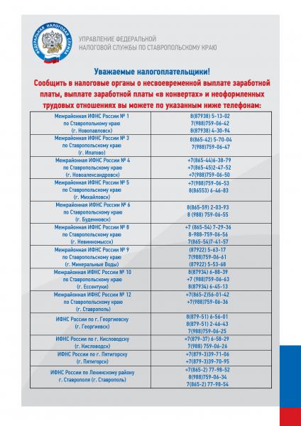 Сообщить в налоговые органы о несвоевременной выплате заработной платы, выплаты заработной платы "в конвертах" и неоформленных трудовых отношениях вы можете по указанным телефонам Управления Федеральной налоговой службы по Ставропольскому краю (см. приложение)