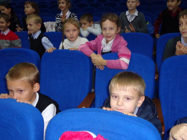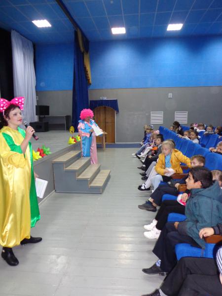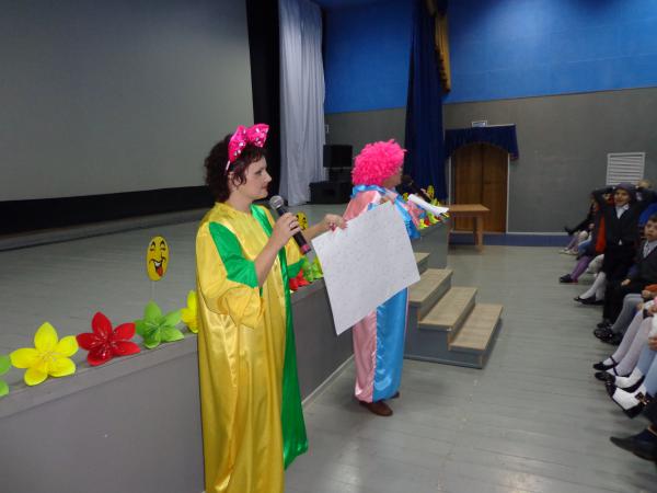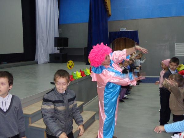 Клоуны поиграли с детьми в увлекательную игру на проверку внимательности. Затем каждый из присутствующих ребят поделился своей улыбкой, изобразив ее на листе ватмана. Все дети очень старались. В результате получилась большая красивая и улыбчивая открытка, которую потом школьники подарили любимым учителям.