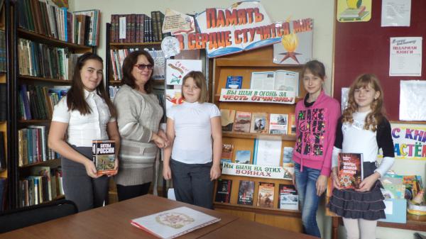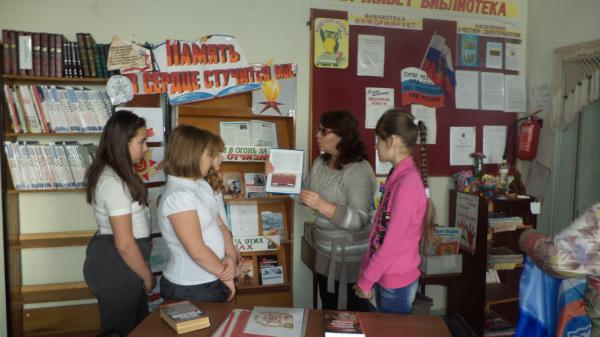 Учащимся МОУ СОШ № 2, была представлена книжная выставка « Память в сердце стучится мое ». Ведущая Тимошенко И.В.,обратила внимание ребят на то,что в этом году наша страна отмечает 70-ую годовщину Победы советского народа в Великой Отечественной войне 1941-1945гг. Провела обзор и беседу у книжной выставки, познакомила участников мероприятия с представленными книгами,особое внимание обратила на события 1943 года - освобождение Кочубеевского района от немецко-фашистских захватчиков. Организаторы мероприятия показали фотографии из книг с хроникой тех лет, рассказали о наших земляках, которые были удостоены звания Героя Советского союза. В заключении прослушали песню « Священная война».