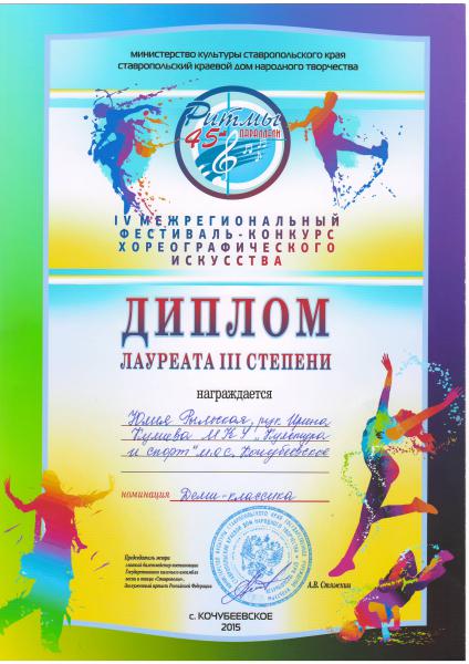 Юлия Рыльская, солистка коллектива "Молодость" (МКУ "Культура и спорт м.о. с. Кочубеевское") с хореографической композицией "Лети, перышко" стала лауреатом III степени.