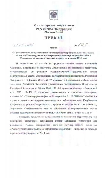 Об утверждении документации по планировке территории для размещения объекта "Реконструкция магистрального нефтепровода "Малгобек - Тихорецк" на переходе через автодорогуна участке 289,1 км"