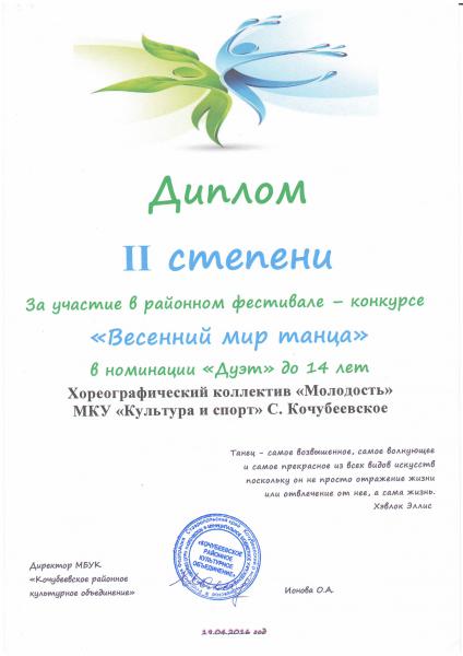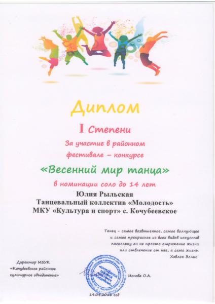 19 апреля 2016 года, в селе Кочубеевском состоялся районный фестиваль – конкурс «Весенний мир танца». Солистка коллектива «Молодость» (МКУ «Культура и спорт м.о. село Кочубеевское») Юлия Рыльская стала дипломантом I степени, дуэт Тарасенко Яна и Рыльская Юлия - дипломанты II степени.