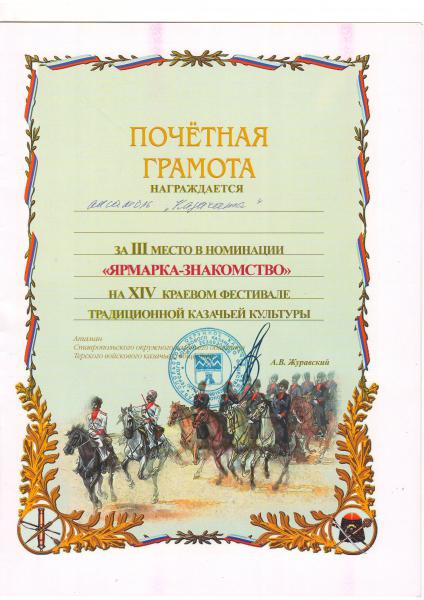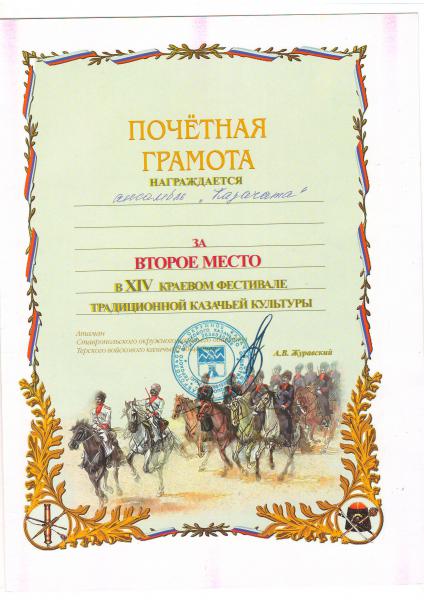 Жюри присудило третье место ансамблю «Веселые привалы» из Ипатовского станичного казачьего общества. Вторыми стали «Казачата» из села Кочубеевского. Первое место завоевал ансамбль «Казачий круг» из села Александровского. Главный же приз - Гран-при - достался ансамблю «Долина», представлявшему Кисловодскую казачью общину. В холле учреждения культуры были развернуты выставки старинных предметов быта и изделий декоративно-прикладного творчества, а зрителей и участников фестиваля угостили блюдами казачьей кухни.