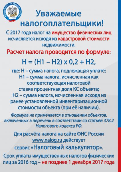 С 2017 года в Ставропольском крае изменились правила расчета налога на имущество физических лиц. При расчете налога на имущество физических лиц до 2017 года применялась инвентаризационная стоимость недвижимости. Теперь учитывается кадастровая стоимость, которая максимально приближена к рыночной стоимости. То есть по обязательствам 2016 года в 2017 году мы будем платить налог на имущество уже по кадастровой стоимости.