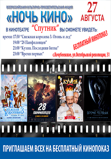 В рамках Всероссийской акции "Ночь кино - 2017" 27 августа 2017 года в кинотеатре "Спутник" состоится бесплатный показ фильмов